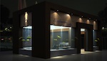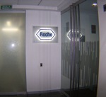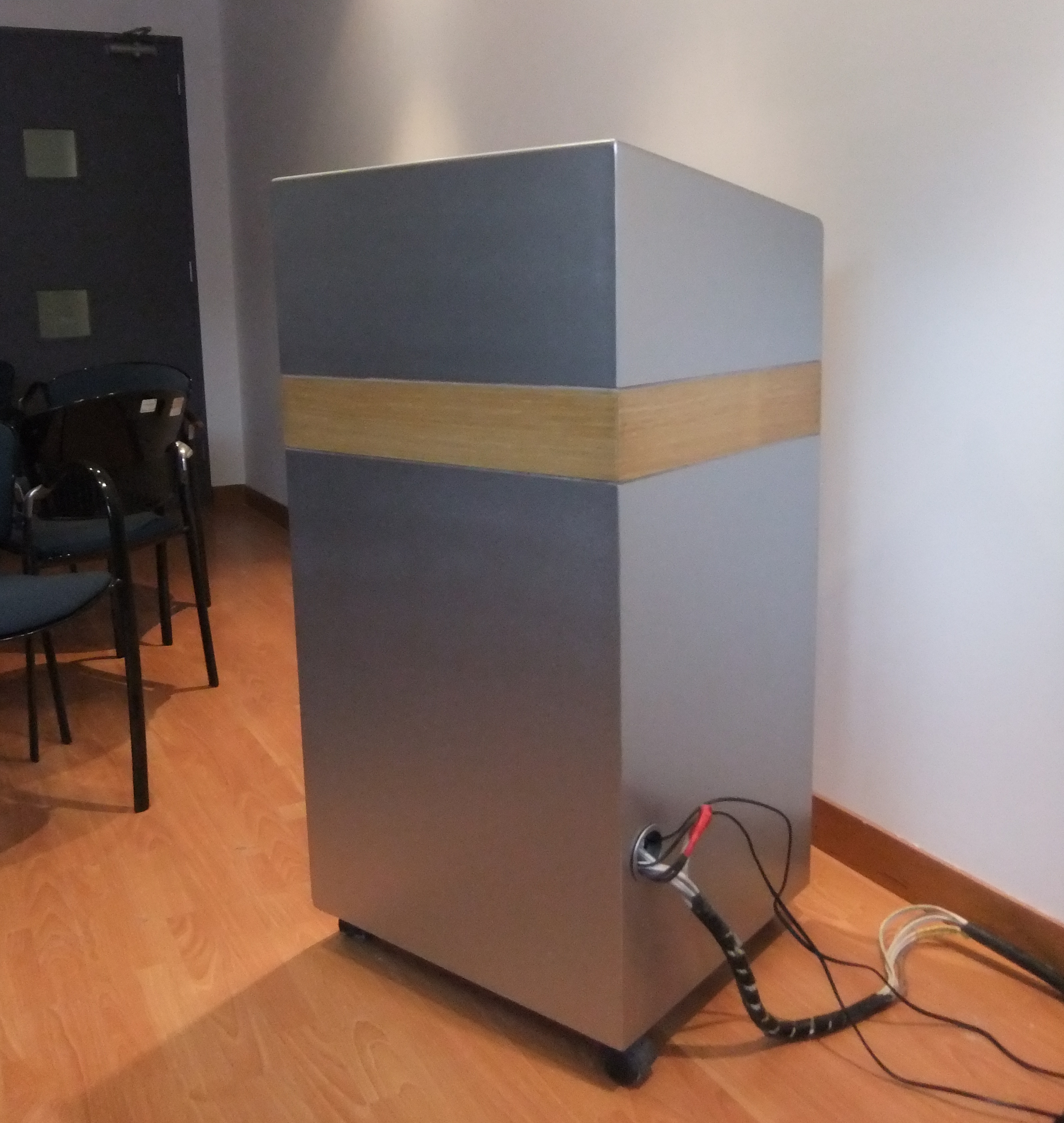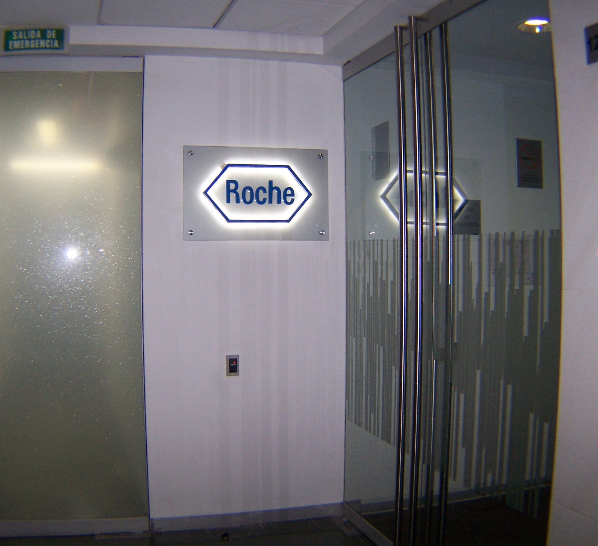 Logo de cristal templado con sujetadores en acero inox, lamina pavonado, texto en MDF con acabado en poliuretano y retroiluminado con leds