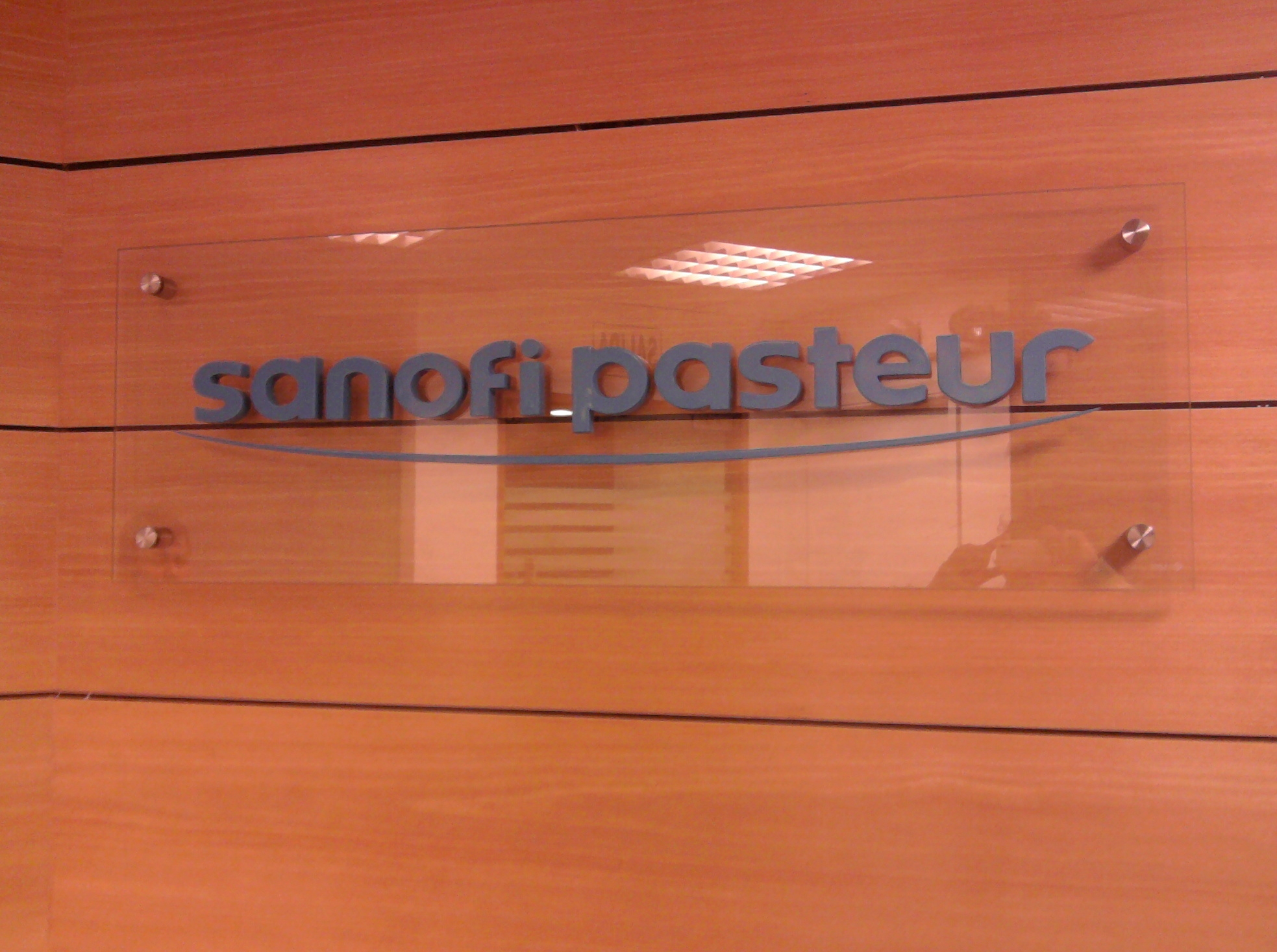 Logo de cristal templado con sujetadores en acero inox y texto en lamina pavonada calada