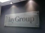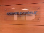 Logo de cristal templado con sujetadores en acero inox y texto en MDF con acabado en poliuretano.