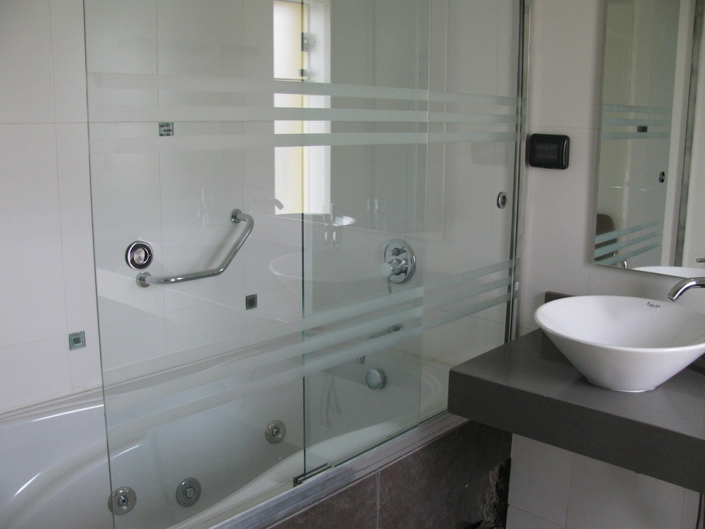 Servicios higiénicos: puertas corredizas en cristal templado, instalación de tinas.